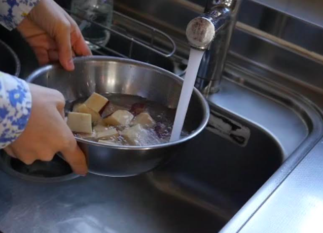 さつまいもはサッと水気を切ることで余分なでんぷんを落としホクホクに仕上がります。