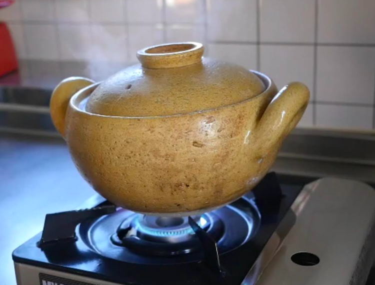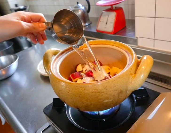 ①鍋にさつまいも、1/2カップの水をいれてやや強火にかける(土鍋がおすすめ)