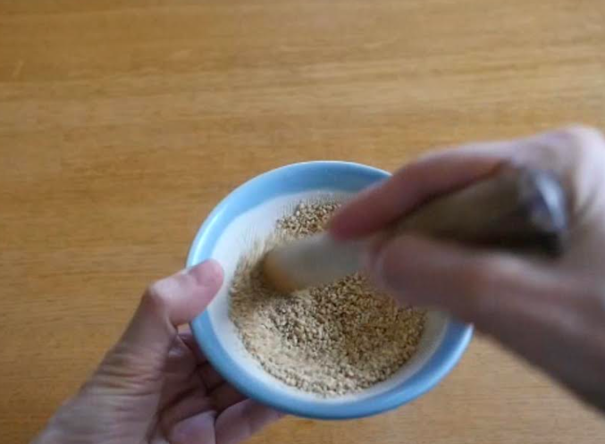 余熱調理中に分量のゴマをする。(市販のすりごまでも良いがすりたての方が風味はよいのでおすすめ)