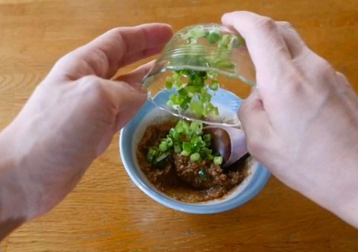 味噌・みりんを混ぜ、様子を見ながら少量の水を加え最後にネギをいれる