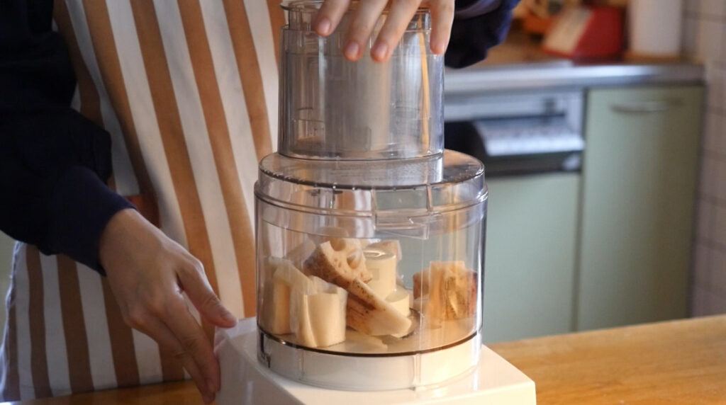 皮ごとのれんこんでもフードプロセッサーにかければもちもちしたペースト状にすることができます。