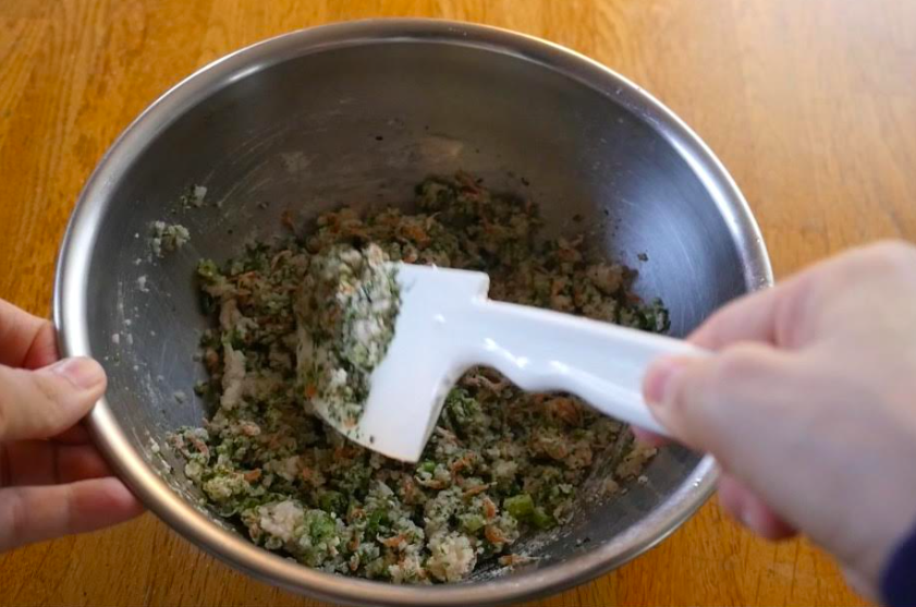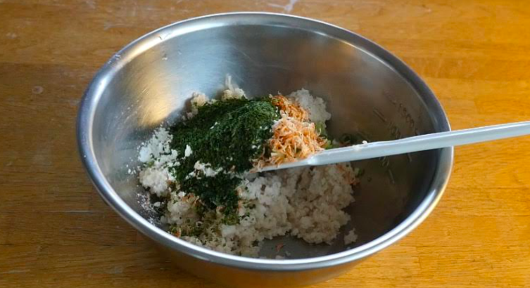 ②ボウルにすりおろしたれんこん、刻んだ小ネギ、干しえび、米粉、(卵)を加え、よく混ぜます。